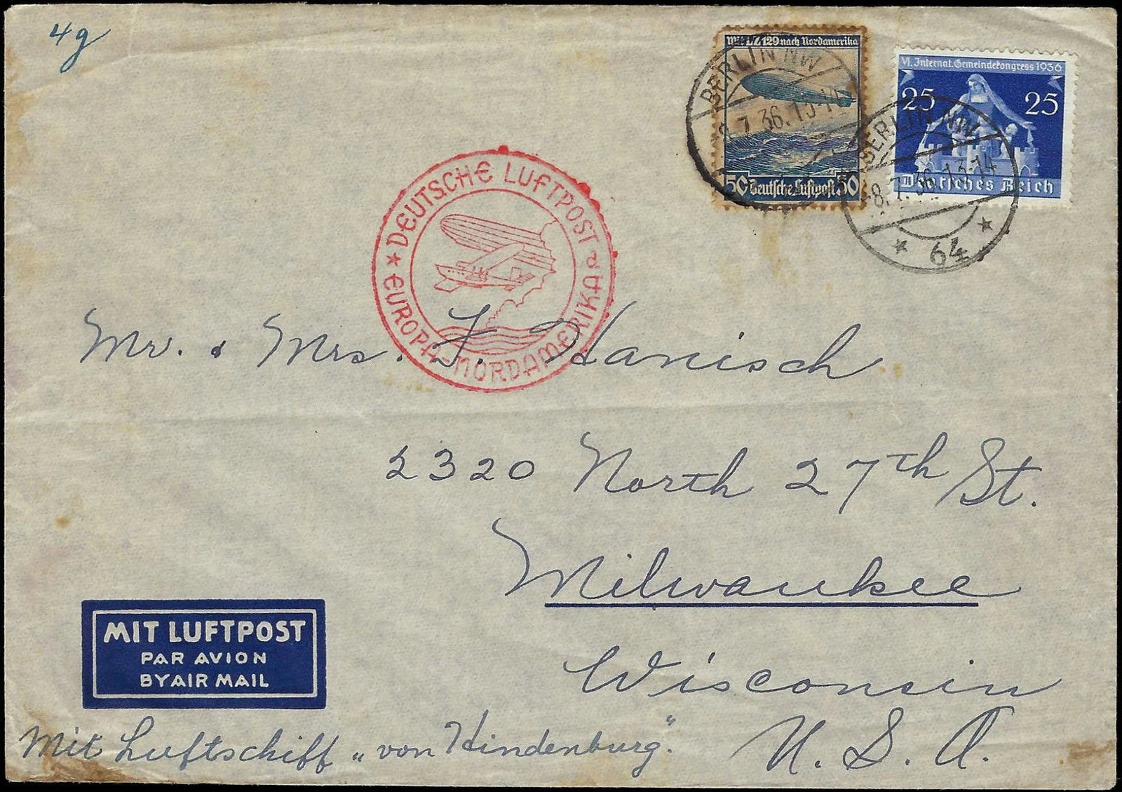 1936 Hindenburg Transported Cover Berlin, Germany to Milwaukee