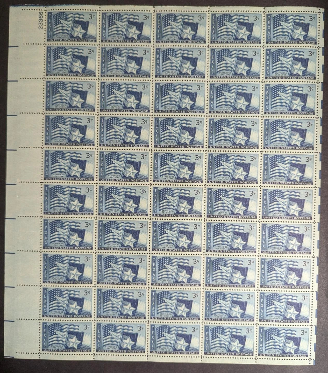 1945 USA Texas Statehd 3c Sheet -Scott 938 -MNH, Undisturbed OG -No Sig Flaws
