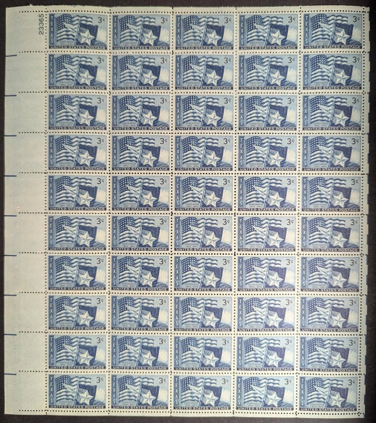 1945 USA Texas Statehood 3c Sheet -Scott 938 -MNH, Undisturbed OG -No Sig Flaws