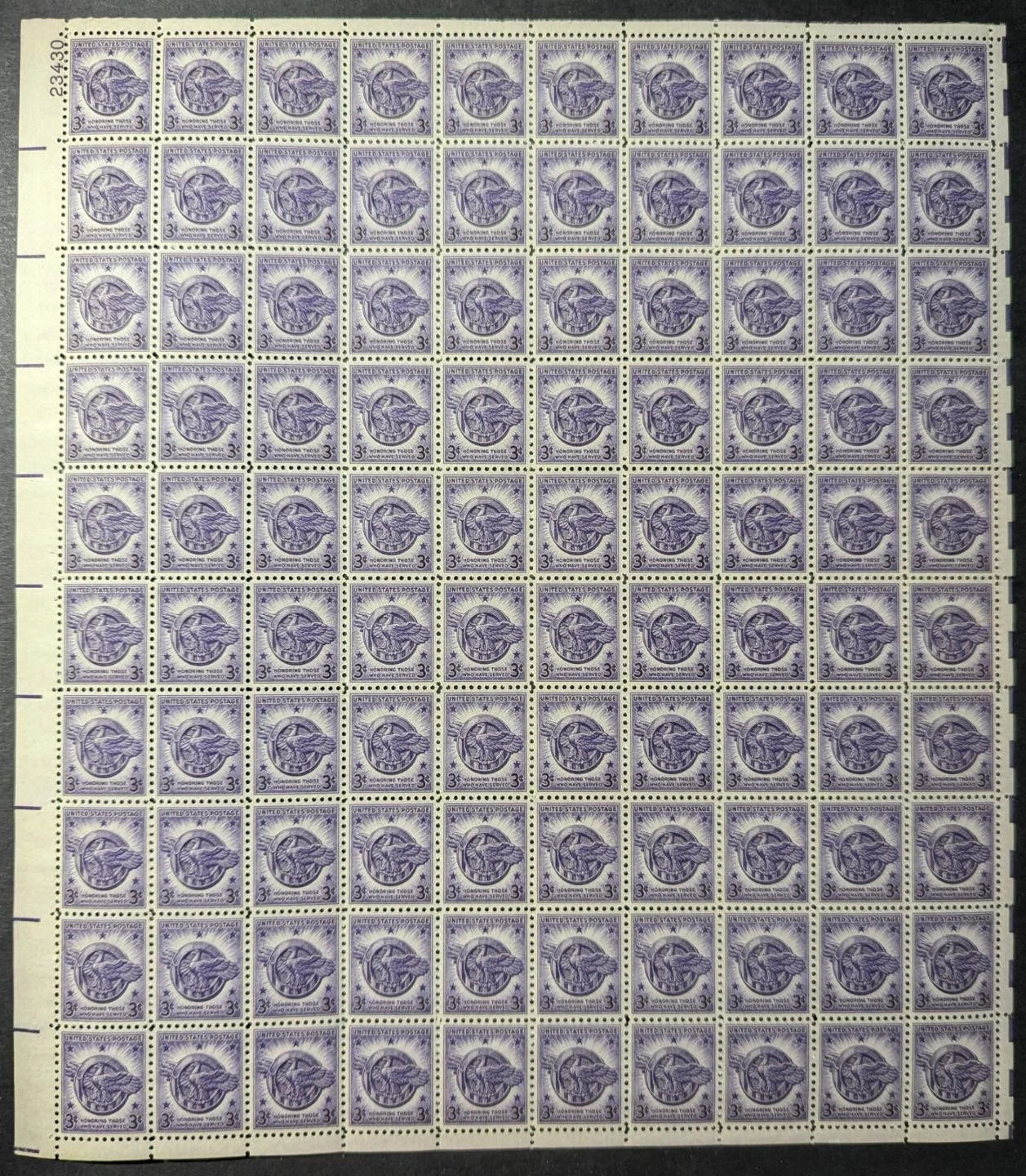 1946 USA Hon Discharge 3c Sheet -Scott 940 -MNH, Undisturbed OG -No Sig Flaws -2
