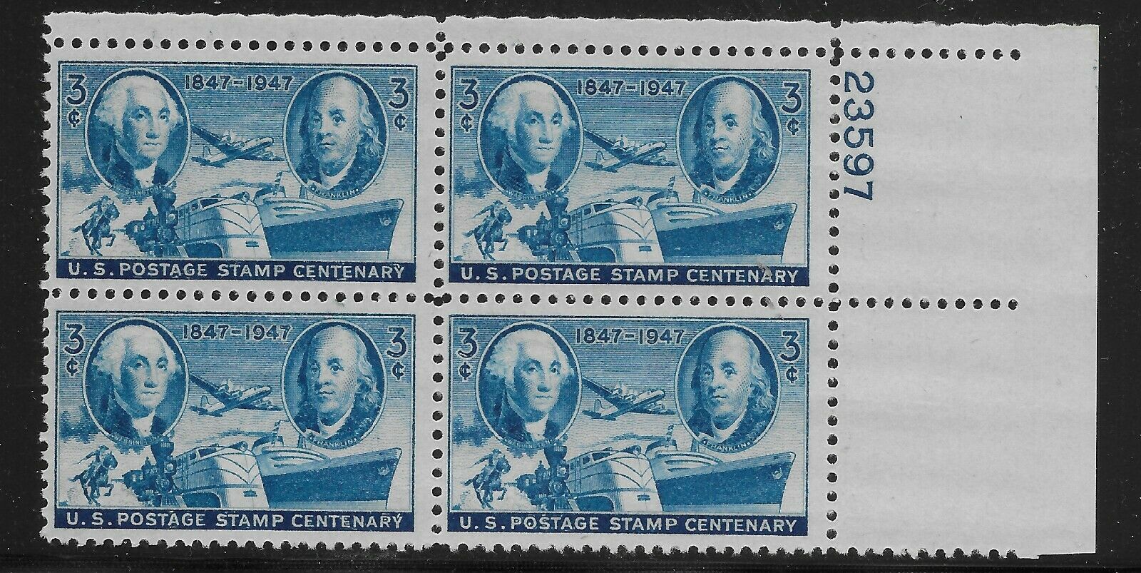 1947 US Postage Stamps Centenary Plate Block of 4 3c Postage Stamps - MNH, OG - Scott 947 - CX916
