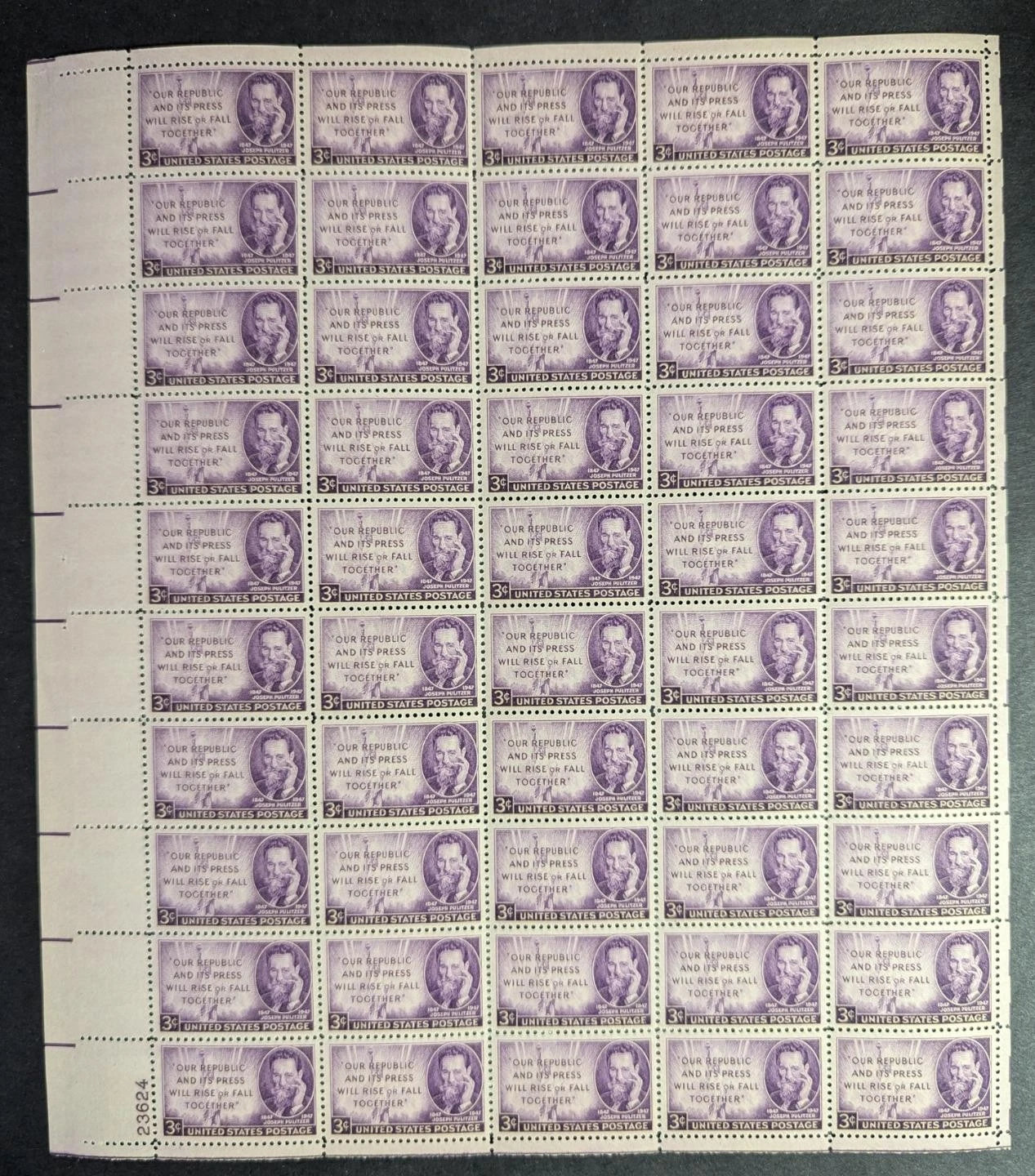 1947 USA Pulitzer 3c Sheet -Scott 946 -MNH, Undisturbed OG - No Sig Flaws