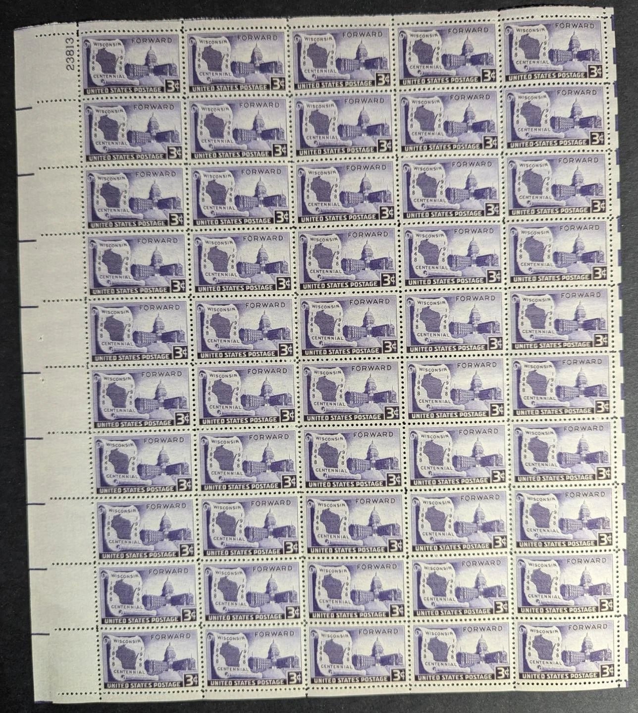 1948 USA Wisconsin 3c Sheet -Scott 957 -MNH, Undisturbed OG - No Sig Flaws-2