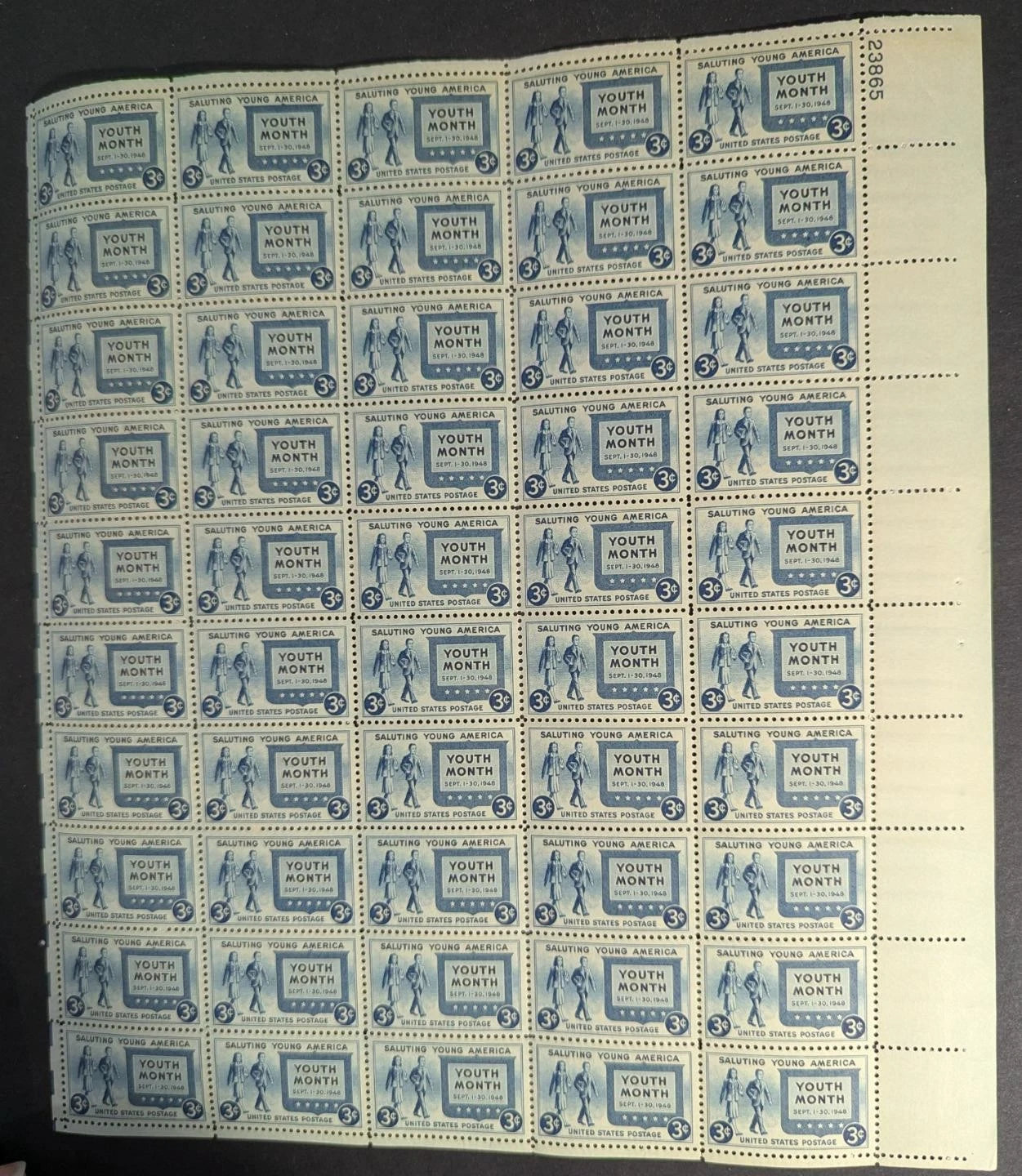 1948 USA Youth Month 3c Sheet -Scott 963 -MNH, Undisturbed OG - Margin Crease UR