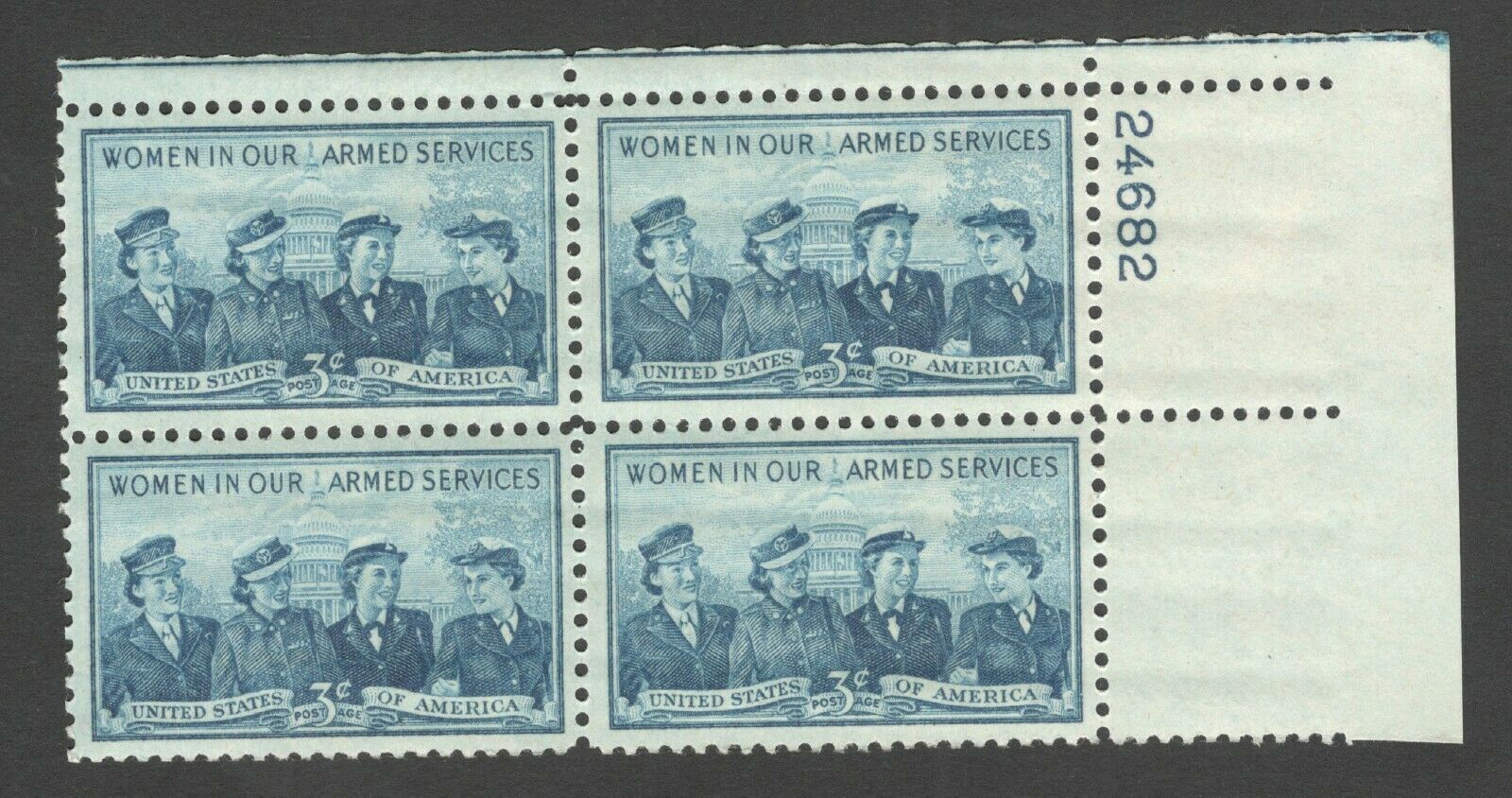 1952 Women In Our Armed Services Plate Block of 4 3c Postage Stamps - MNH, OG - Scott 1013