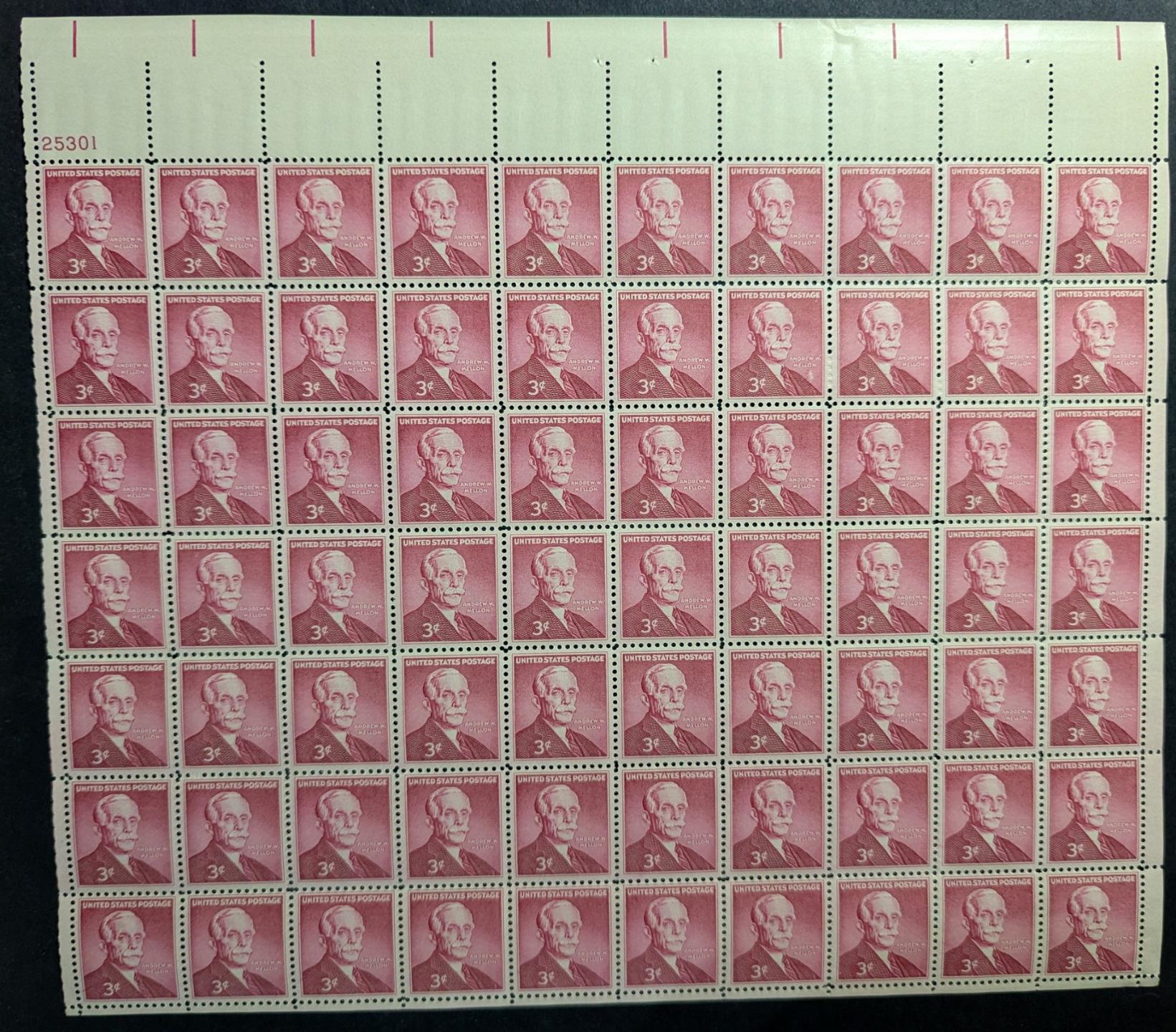 1955 USA 3c Andrew Mellon Sheet -Scott 1072 -MNH, Undisturbed OG - No Sig Flaws