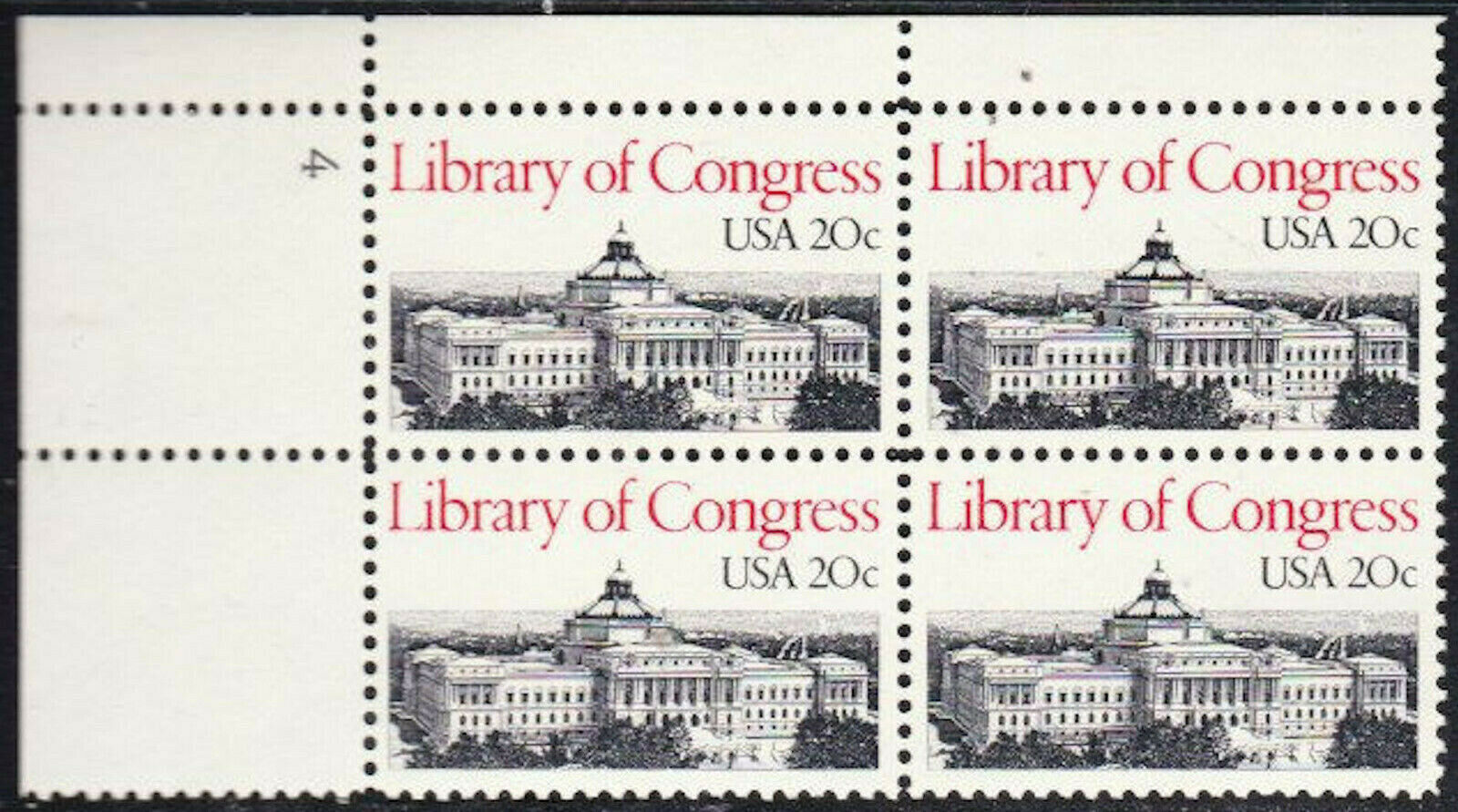 1982 Library Of Congress Plate Block Of 4 20c Postage Stamps - Sc 2004 - MNH - CW463b