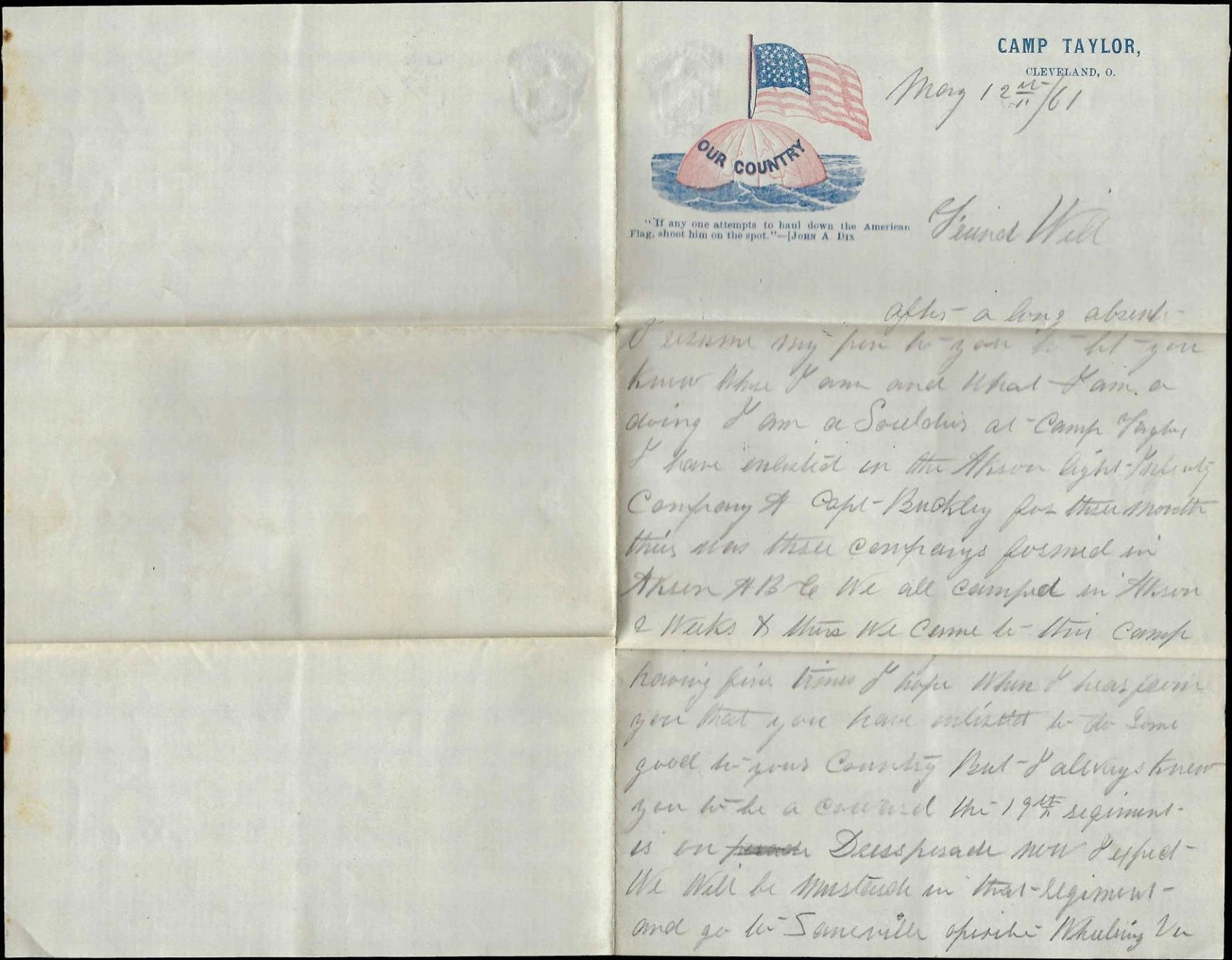 5-12-1861 Civil War Letter From Earliest Days of Camp Taylor, Cleveland - Rare!
