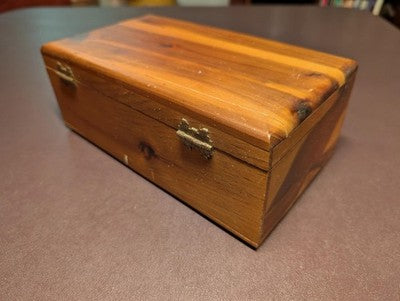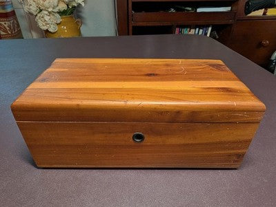 Vintage Lane Cedar Dresser Jewelry Trinket Chest Box - Solid with mostly light wear from age including scattered light scuffing. Marked under lid is "Boyd Furniture Company - Leesburg, Florida". Measures on the outside about 9L x 4 7/8W x 3 3/8H. Key not included. Free shipping.