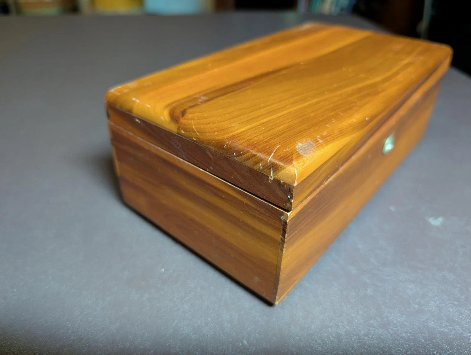 Vintage Lane Cedar Dresser Jewelry Trinket Chest Box in Better Condition - Solid with mostly light wear from age with only some scattered light scuffing. Marked under lid is "Lane- Presented By Kane Furniture Company - Orlando-Cocoa". Measures on the outside about 9L x 4 7/8W x 3 1/4H. Key not included. Free shipping.