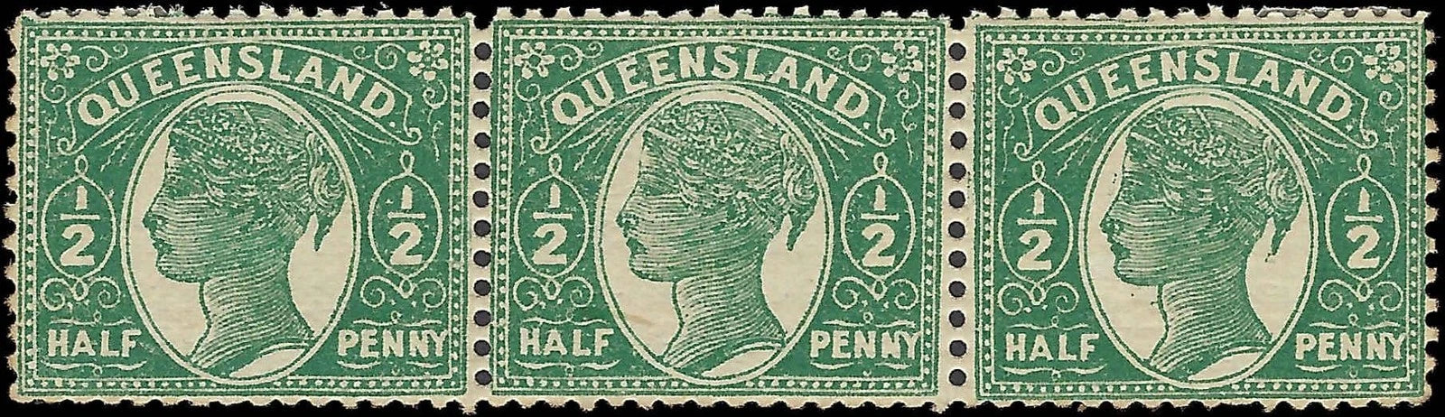 c1895 - Queensland, Australia - Scott # 101, strip of 3 (No WM) - MNH, Dist on 1