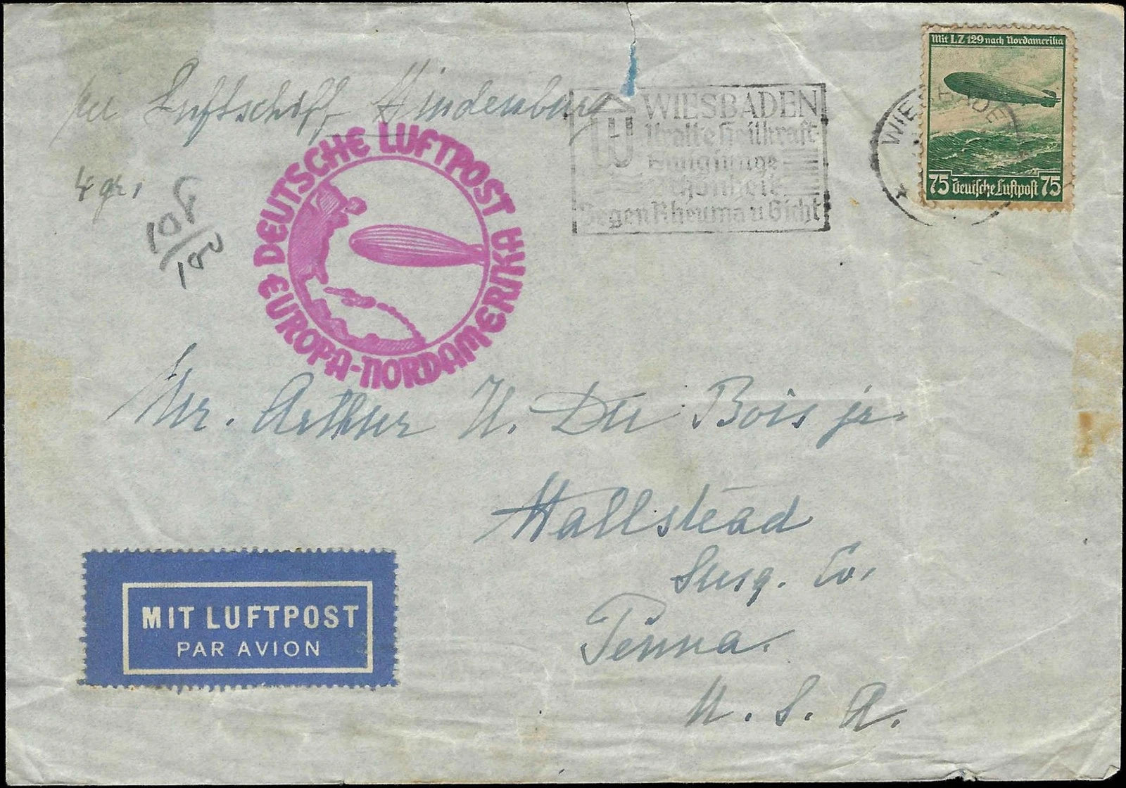 c1936 Hindenburg Transported Cover Wiesbaden, Germany to Hallstead, TN -READ