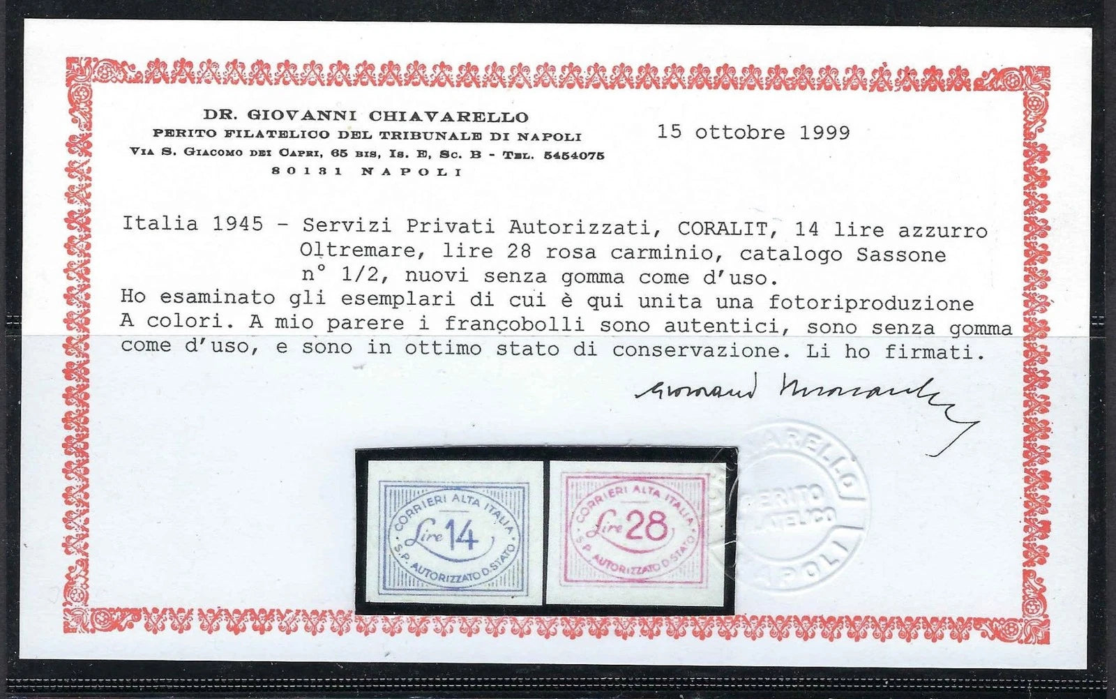 Dr. Giovanni Chiavarello (Napoli), dated 15 October 1999, with color photographic reproduction.