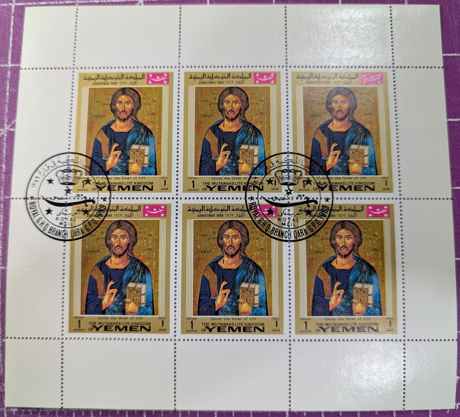 Over 100! 1969 Yemen Sheets Featuring the "Christ Pantocrator" or "Christ, The Giver of Life" Painting - 1969 Cancelled with Gum and not listed in the Scott Catalog. All 100+ are separated by glassine pages for safe mailing and most or all appear to be in excellent mint condition! All look identical or near identical to the one shown in the photo. Great opportunity for resale or gifts!