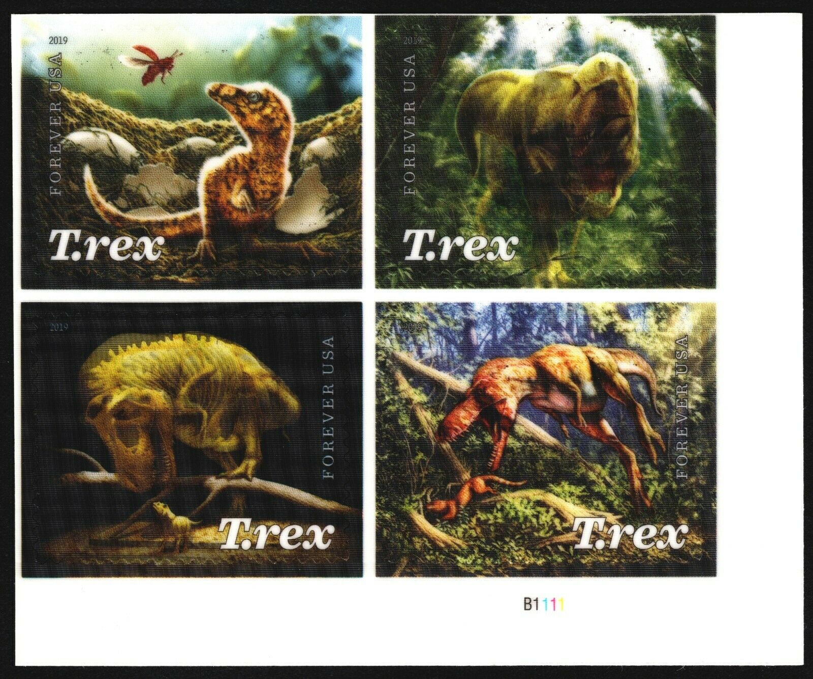 T Rex Tyrannosaurus Rex Dinosaur Plate Block of 4 Forever Postage Stamps - MNH, OG - Sc# 5410-5413
