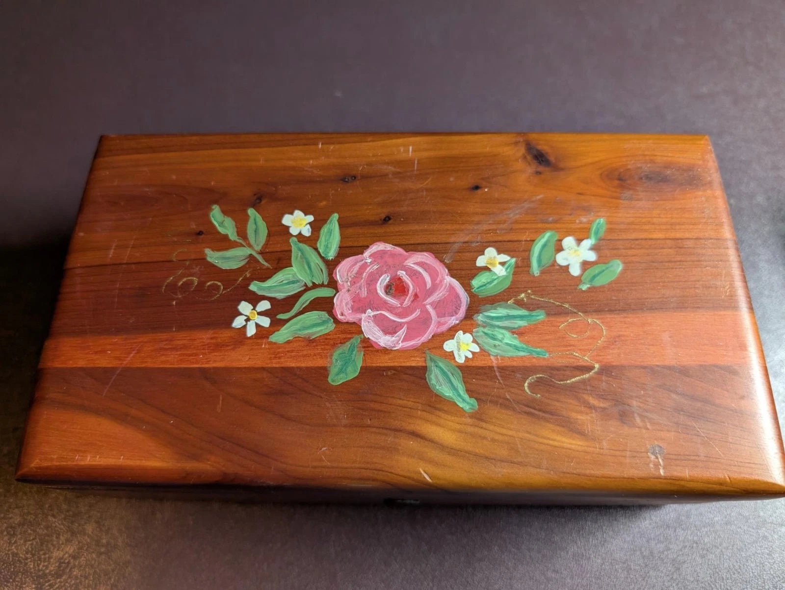 Vintage Lane? Custom Painted Cedar Dresser Jewelry Trinket Chest - Clean with only very light wear from age (See photos). There are no markings identifying it as Lane however the construction and size appear identical to many others labeled as Lane. Outside Measurements are about 9L x 4 7/8W x 3 1/2H. Key not included. Free shipping.